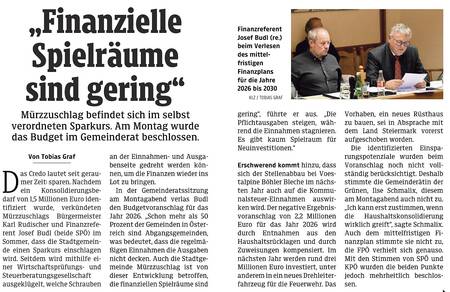 In der Gemeinderatssitzung am Montagabend verlas Budl den Budgetvoranschlag für das Jahr 2026. „Schon mehr als 50 Prozent der Gemeinden in Österreich sind Abgangsgemeinden, was bedeutet, dass die regelmäßigen Einnahmen die Ausgaben nicht decken. Auch die Stadtgemeinde Mürzzuschlag ist von dieser Entwicklung betroffen, die finanziellen Spielräume sind gering“, führte er aus. „Die Pflichtausgaben steigen, während die Einnahmen stagnieren. Es gibt kaum Spielraum für Neuinvestitionen.“
