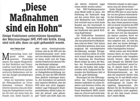 Von FPÖ-Vizebürgermeister Arnd Meißl heißt es dazu: „Die Erhöhung der Parktarife mag auf den ersten Blick eine logische Maßnahme sein. Tatsächlich vertreibt man so noch mehr Kunden aus der Innenstadt in Richtung Fachmarktzentrum am Stadtrand oder gleich Richtung Kapfenberg.“